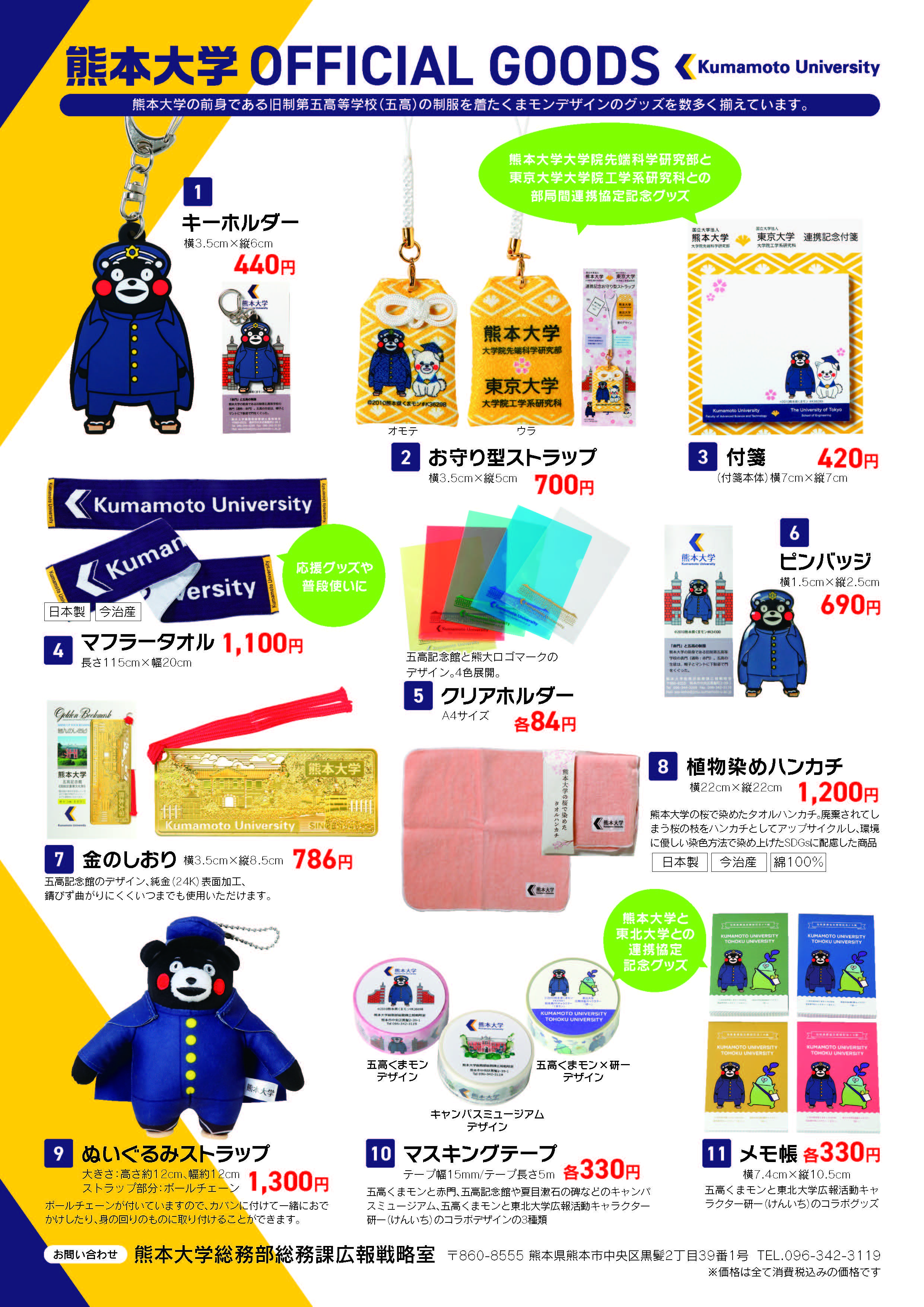 熊本大学の前身である旧制第五高等学校(五高)の制服を着たくまモンのグッズを数多く揃えているほか、ハンカチ、金のしおり、クリアホルダー等があり、熊大らしさが感じられるグッズとして好評です。