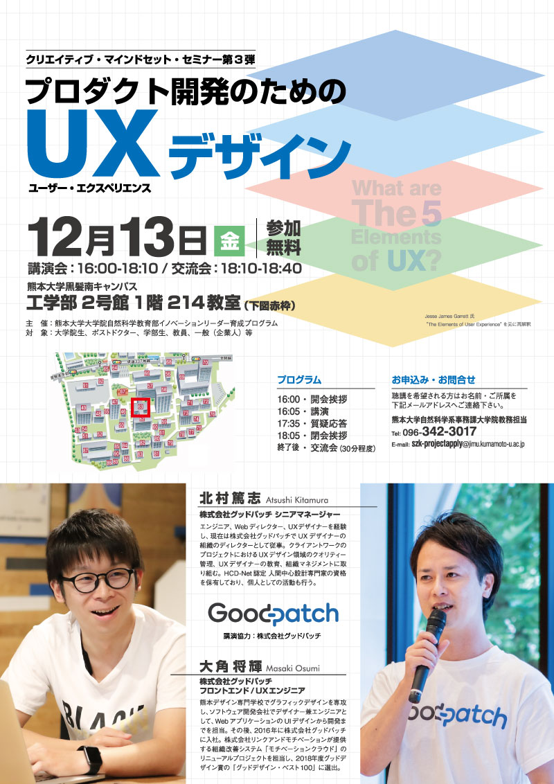 大学院自然科学教育部?イノベーションリーダー育成プログラム?では、株式会社グッドパッチ 北村 篤志氏、大角 将輝氏を講師にお招きし、今年度クリエイティブ?マインドセット?セミナー第3弾「プロダクト開発のためのUX(ユーザー?エクスペリエンス)デザイン」講演会を開催します。