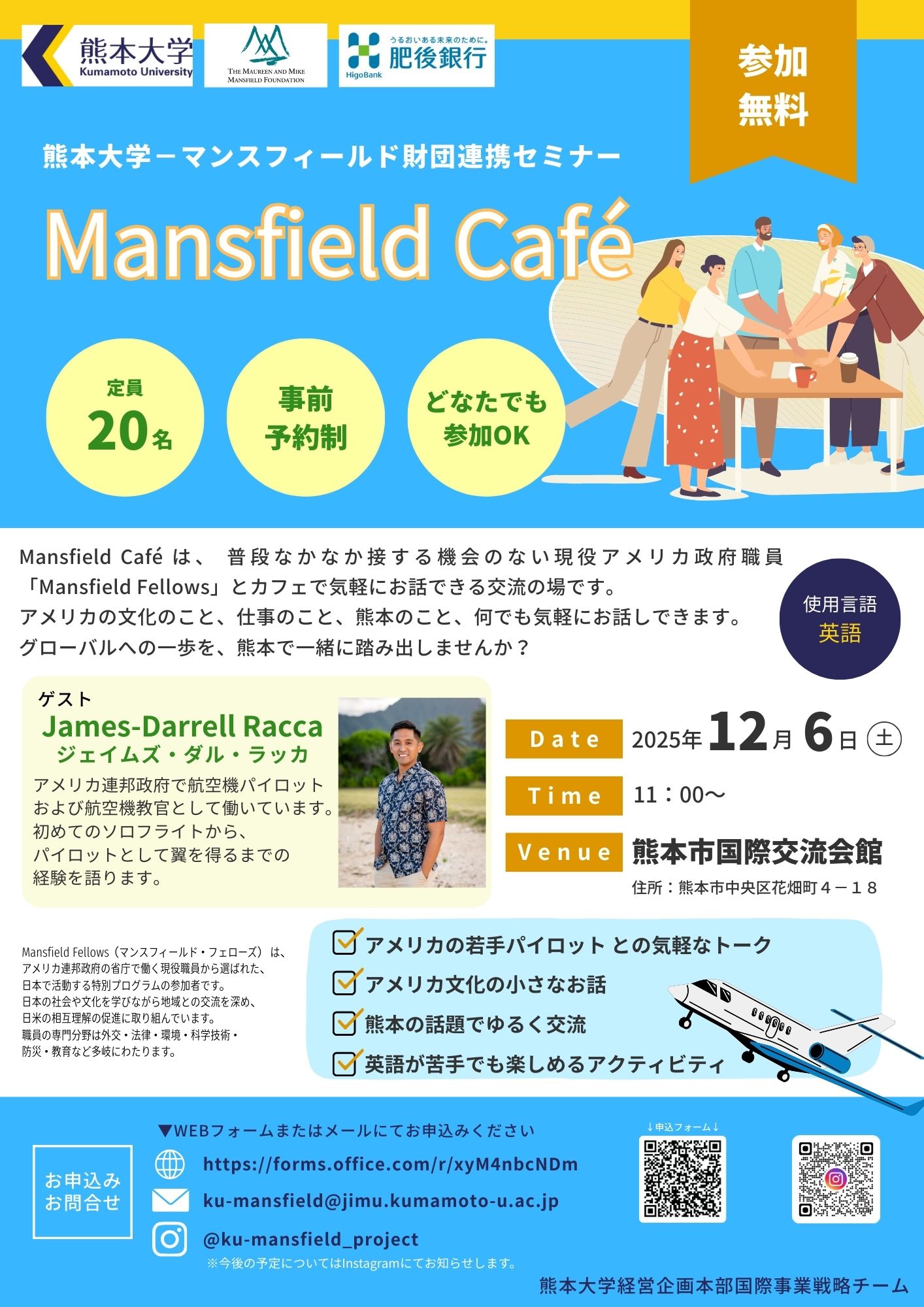 熊本大学では、米国のモーリーン?アンド?マイク?マンスフィールド財団(以下マンスフィールド財団)と連携したプロジェクトを行っており、その一環として交流イベント(Mansfield Café)を下記のとおり開催いたします。