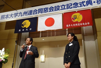 講演会終了後の祝賀会では、九州連合同窓会の先輩にあたる熊本大学東京連合同窓会の中野栄二会長(昭和42年薬学部卒)と熊本大学関西連合同窓会の西山多加志会長(昭和44年工学部卒)から挨拶が行われ、3つの連合同窓会で連携?協力し、共に母校を盛り上げていきたいとの言葉が述べられました。