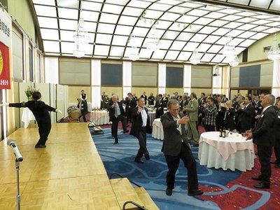 交流会の終盤では、体育会応援団の中村あゆみ氏(応援団リーダー部第44代団長、理学部2年)と応援団OBによる“巻頭言”と“五高寮歌”が披露され、参加者による合唱が高らかに会場に響き渡りました。最後に、今村 遼平副会長(昭和38年理学部卒)から挨拶があり、謝意が述 べられ、盛況のうちに会は終了となりました。