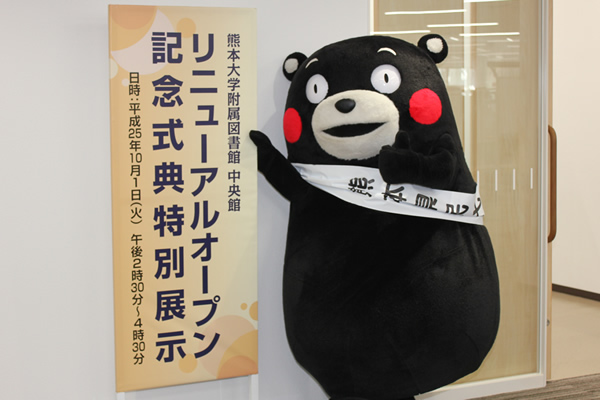 続いて、図書館職員から利用者代表への記念品贈呈、利用者代表から大学関係者への花束贈呈、関係者によるテープカットが行われ、記念品贈呈からは、熊本県民を代表してくまモンも駆けつけ、みごとな(?)パフォーマンスを披露しました。