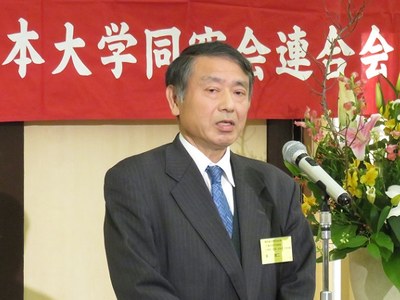 基調講演では、原田学長から平成28年(2016年)熊本地震の被害状況とその復旧と復興の進捗について報告がありました。熊本大学が、教育研究環境の復旧のみならず地域の復興に向けた取組を、学長のリーダーシップの下で全学一丸となって迅速に実施したことが、11月に発表された国立大学法人等の平成28年度評価においても、「特筆すべき進捗状況にある」との最高位の評価をうけたとの紹介があり、今後も教育?研究?社会貢献のさらなる高度化にむけて邁進することについて同窓会からの理解と協力を賜りたいとの依頼がありました。