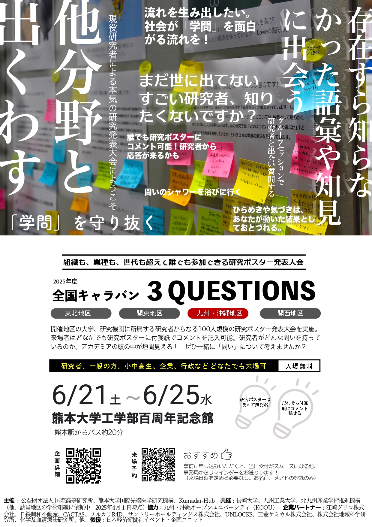 このたび熊本大学では、分野、組織、世代を超えて研究テーマそのものを深堀する全国規模の学際的研究ポスター発表大会「全国キャラバン3 Questions - 九州?沖縄地区編 - 」を開催します。本イベントは2024-2025年度、2カ年をかけて実施している全国規模の学際共創ネットワーキングイベントです。2024年度には、北海道、東海、北信越、四国地区にて開催し、2025年度は、東北(8月)、関東(10月)、関西(12月)地区で開催予定です。